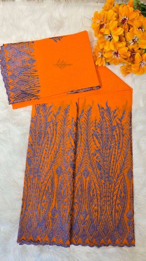 Salouva tissu normal fond orange dessin violet brillant avec péna.
